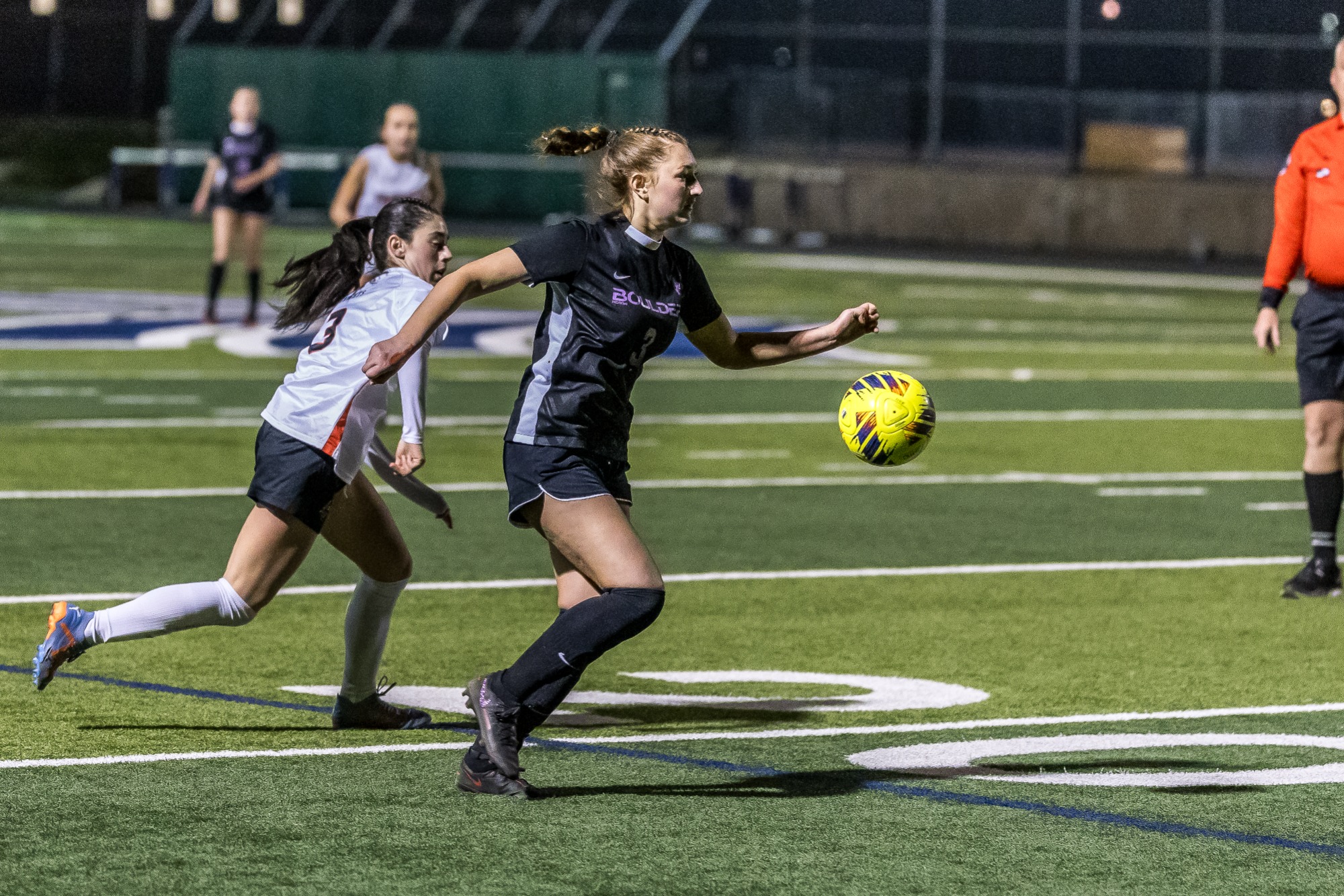 Once composed, the Panthers began dominating possession and pinning Brighton in their own half. At the 18-minute mark, Boulder was awarded a free kick just outside the top of the box. Mia DeJohn stepped up and curled a precise strike over the wall and past the keeper to give Boulder a 1–0 lead.
